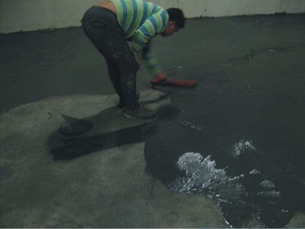 4)若基層有滲漏,須事先進行防水處理。 基層表面的裂縫要剔鑿成 “V” 型槽,并用自流平砂漿修補平整。凹坑、孔洞均也須用自流平砂漿修補平整。